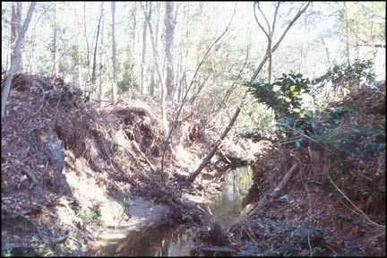 This stretch of Long Leaf Creek is located in a residential neighborhood known as Long Leaf Hills Subdivision. The project reach starts upstream from Shipyard Boulevard and ends at the confluence of Hewlett's Creek. Streams in the Wilmington area, including Long Leaf Creek, have been altered by accepting increased stormwater runoff due to urbanization of the watershed. The stream floods frequently in the lower section. This increased flooding and high peak discharges have caused significant bank erosion and channel enlargement. The channel has become both deeper and wider. Compounding the increased stormwater problem is bank seepage and uncontrolled overbank runoff, which also contributes to bank failure. Finally, the creek has been used as a dump-site for organic garden debris which kills the bank vegetation and is exasperating erosional failures. These mechanical, hydrologic, and hydraulic problems have caused degradation of the aesthetic and riparian corridor values in the creek. Public meetings illuminated the desirable past conditions of the creek, the concerns of the existing conditions and their interest for stabilization and restoration in terms of how they wanted to use and enjoy their creek in the future. See Figures 7 and 8.