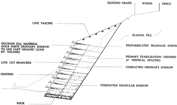 As shown on Figure 1, four types of backfill were used to reconstruct the slope in addition to the crushed-stone drainage layer at the base. These backfills are granular borrow, ordinary borrow, 50/50 mix, and specified fill. The first three constitute the structurally competent core while the specified fill at the face provides a media amenable to plant growth. The specified fill used in the front 3.05 meters (10 feet) of each lift is a blended material consisting of four parts ordinary borrow to one part organic loam by volume. It should be noted that the lifts were constructed to slope away from the face (ù20¼) and that fertilizers were added to each lift to further optimize the growing conditions for the installed brushlayers.