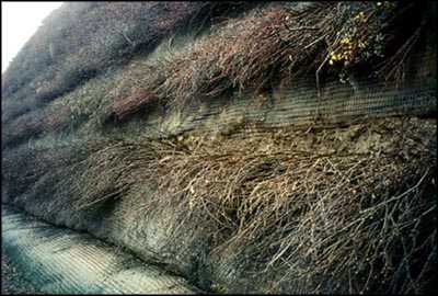 In this case, live cuttings from woody plants were installed in the ground in specific configurations and served immediately as soil reinforcements, horizontal drains, barriers to earth movement and hydraulic pumps or wicks. Much the same as with geogrids, additional stabilization occurs when the roots develop along the length of the embedded stems. Woody vegetation, when properly designed and installed in these specific configurations, can create stable, composite earth masses. Its functional value has been well established. These cuttings can be used alone or in combination with geosynthetic materials.