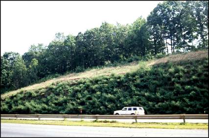 Organic material - To provide favorable conditions for plant growth, it was desirable from an agronomic standpoint to incorporate organic material in the backfill. To accommodate this, the outer 3.05 meters (10 feet) of slope, starting approximately 1.52 meters (5 feet) up from the base of the slope, was backfilled with a blended material consisting of four parts of ordinary borrow to one part loam by volume. By carefully selecting the mixture and the location within the slope and checking the global stability and location of failure planes, it was possible to satisfy both the agronomic and geotechnical design requirements.